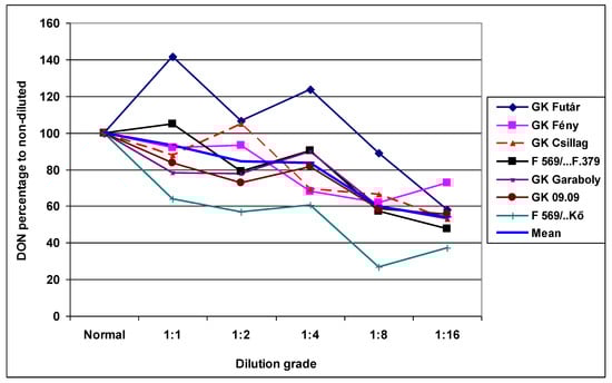 The differences between cultivars were also more clearly expressed (Table 8A). The resistance differences were highly significant, and a five-fold difference was seen between the most resistant and most susceptible genotypes. The resistance ranking differed for the different dilutions, indicating that this problem may be seen in regular experimental practice. The difference between dilution grades was significantly smaller, between 12.56 and 6.94 mg/kg (Table 8A). The smallest decrease, of 35%, was found in the most aggressive Fc 12375 isolate; the three other isolates showed decreases of 52%, 65%, and 43%. These decreases were larger than those found for DI and FDK. These deviations are shown in Figure 7, where the performance of the given cultivar is shown as a percentage of the non-diluted original inoculum. When dilution did not have the same influence on aggressiveness for the isolates used, nearly parallel curves with stable resistance differences can be seen. This is, however, not the case. It is not possible to forecast the effect of the dilution. Interestingly, the genotype reactions differed at different dilution grades. The correlations were significant in 11 cases of the 21, and only two cases showed significance at p = 0.001 (Table 8B). However, in less aggressive isolates, the cultivar differences were not as significant as in the most aggressive Fc12375 isolate. At a high level of aggressiveness, there was a higher probability of finding highly significant differences between genotypes.