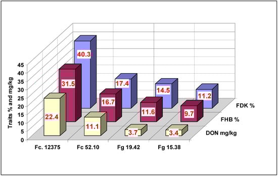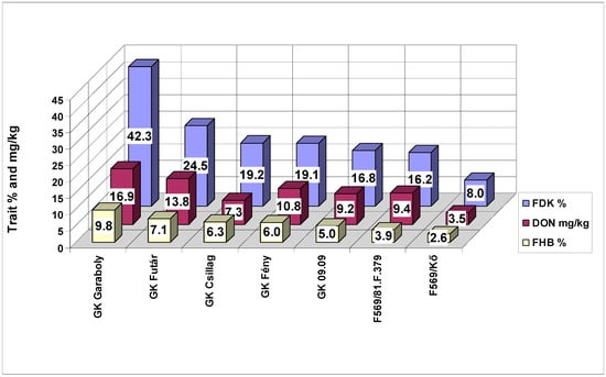 The cultivars used showed similar performances to the different traits (Figure 10). The one exception was GK Csillag, which produced the second-lowest DON value, and it was less than those of the other three genotypes that had lower values for FHB and FDK. In another experimental series, this cultivar showed the same result (Mesterhazy, unpublished), suggesting this is a significant phenomenon. The correlations between traits were somewhat lower (FHB–DON r = 0.9558 (p = 0.001) and r = 0.8912 and 0.9155 (p = 0.01). For this reason, correlations themselves are not sufficient to infer the relevance of these traits, and the data points should also be checked.