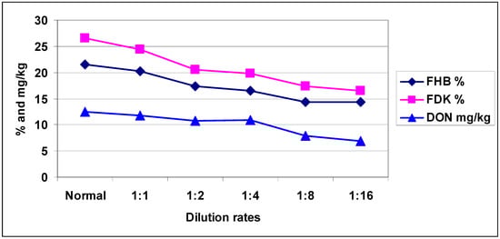 The mean of the four isolates (Figure 9) shows that the responses were much more similar than they were against the individual isolates. There were visible differences, but the correlations were between traits at different dilution rates (r = 0.92–0.99). There were 252 replications for each data point, and the correlations thus have a solid basis. We should remark that the DI and FDK did not change between the last two dilutions, but DON showed a further decrease at 1:8 and 1:16 dilutions.