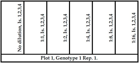 One and two experiments were performed in 2013 and 2014, respectively; in total, three independent biological replicates were made. The plant material was evaluated in the nursery of the Cereal Research Nonprofit Ltd. in Szeged, Hungary (46°14′24″ N, 20°5′39″ E) over two seasons (2012/2013 and 2013/2014). The field experiments were conducted in three replicates in a randomized complete block design. Each genotype per replicate was shown in six (1 plot per inoculation date) two-row plots of 1.5 m length in mid-October, using Wintersteiger Plot Spider planter (Wintersteiger GmbH, Ried, Austria). The width of the plots was approximately 40 cm. One experiment in 2013 and two experiments in 2014 were sown for the six dilution rates (1:0, 1:1, 1:2, 1:4, 1:8, and 1:16) (Figure 11). In every two rows, subplots were used for the four isolates at about 50 cm distance within the plot. Therefore, a plot contained 24 inoculations. In the test, 21 such plots were made, and randomization was made according to the genotypes. This resulted in 1512 inoculations for the three experiments, and the same number of FDK estimation and DON analyses. The two experiments were carried out in 2014 with different inocula of the same isolates. Thus, the three tests were able to be analyzed in one ANOVA test.