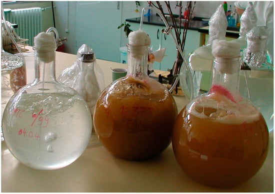 To increase inocula, Czapek–Dox medium (1000 g distilled water, 30 g cane sugar, 1 g monopotassium phosphate, 0.5 g magnesium sulfate, 0.5 g potassium chloride, 0.01 g iron sulfate) was produced in the laboratory. The medium was sterilized and autoclaved in 10 L heat-stable glass balloons for two hours at 120 °C, using the bubble breeding method (Figure 12), in which mycelium and conidia were produced [,]. This inoculum contained conidia and mycelium in different ratios. This is not unique in the plant pathology literature [].