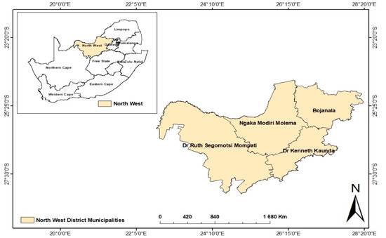 - Stats SA. Provincial profile: North West community survey 2016. In Provincial Profile: North West/Statistics South Africa; Maluleke, R., Ed.; Statistics South Africa: Pretoria, South Africa, 2018; Volume Report 03-01-11, pp. 1–93. [Google Scholar]
