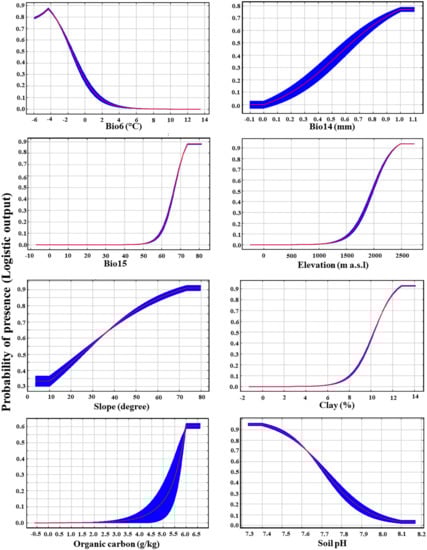 - Abolmaali, S.M.R.; Tarkesh, M.; Bashari, H. MaxEnt Modeling for Predicting Suitable Habitats and Identifying the Effects of Climate Change on a Threatened Species, Daphne Mucronata, in Central Iran. Ecol. Inform. 2018, 43, 116–123. [Google Scholar] [CrossRef]