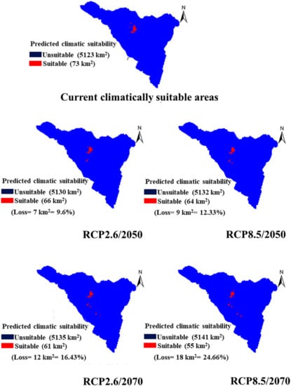 3.4. Future Predictive Distribution Area of P. boveana under Two Global Warming Scenarios