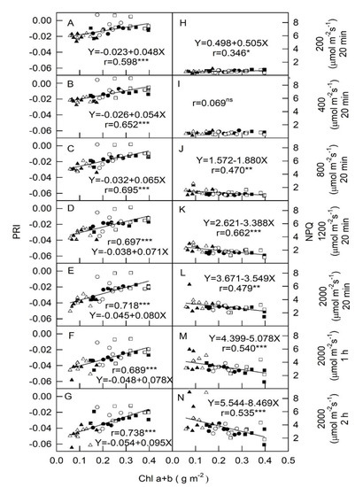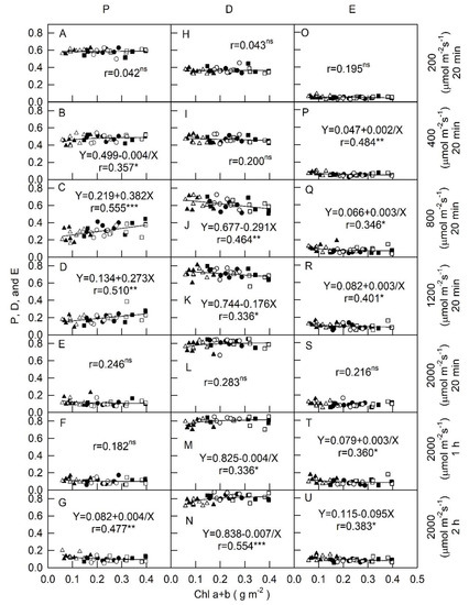 Figure 1 and Figure 2 show thatphotosynthetic electron transport (p) and PRI levels of all plantsdecreased, but thermal energy dissipation (D) and non-photochemical quenching (NPQ) values increased as light intensity increased from 200 to 2000 μmol m−2s−1 PPFD. In addition, relationships among p, D, excess energy (E), and PRI vs. Chla + b in all plants were varied with PPFDs. The p, D, and E values in all plants exposed to 200 μmol m−2s−1were approximately 0.6, 0.4, and 0.1, respectively, and displayed no variation with the change of Chla + b (Figure 1A,H,O). There were positive and significant correlations at r = 0.357, 0.555, and 0.510 between p and Chla + b in all tested plants in response to 400, 800, and 1200 μmol m−2s−1, respectively (Figure 1B–D). The value of p in all plants under 2000 μmol m−2s−1 for all irradiation times was below 0.2 (Figure 1E–G) and displayed no relationship between p and Chl a + b except for a negative correlation (r = 0.477, p < 0.05) between p and Chl a + b under 2000 μmol m−2s−1 for 2 h (Figure 1G). No correlations were observed between D and Chl a + b in all plants under 200, 400, and 2000 μmol m−2s−1 for 20 min (Figure 1I,L). Nevertheless, D was significantly and negatively correlated with Chla + b at PPFDs of 800 and 1200 μmol m−2 s−1 (r = 0.464 and 0.336, respectively; Figure 1J,K). The values of D werenon-linearly significant and positively correlated with Chla + b at r = 0.336 and 0.554 under 2000 μmol m−2s−1 for 1 h and 2 h, respectively (Figure 1M,N). All E values were weakly but significantly and negatively correlated to Chl a + b (r = 0.484–0.346, Figure 1P–R,T,U) in response to all PPFDs, except for no relationships being observed under 200 and 2000 μmol m−2 s−1 for 20 min (Figure 1O,S), indicating that a lower Chl a + b content resulted in an increased E and produced excess energy in PSII in response to different PPFDs. The trend of D against Chla + b in all plants was opposite to p values in response to medium PPFDs (800 and 1200 μmol m−2s−1) and high PPFD (2000 μmol m−2s−1), where medium and high PPFDs yielded relatively higher D values from 0.6 to 0.8 readings (Figure 1J–N) compared to p values (0.1–0.4, Figure 1C–G). These results demonstrate that leaves with lower Chl content showed lower p and led to increasing D to dissipated more excess light energy in PSII under medium PPFD condition. On the contrary, in high PPFD condition, leaves with lower Chla + bcontent had relatively higher p value and lower D level. The E values were less affected by Chl a + b under all tested PPFDs due to relatively low values.