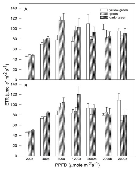 ETR values were analyzed under various light intensities (Figure 3). For full fertilization (panel A), the ETR of all plants under 200 μmol m−2s−1 PPFD did not show any differences. The highest ETR values at 118 μmol em−2s−1 were found in green and dark-green plants under 800 μmol m−2s−1 PPFD, and both green and dark-green leaves had significantly higher ETR values comparedto yellow leaves under 400, 800, and 1200 μmol m−2s−1 PPFDs. However, relatively higher ETR values were found in yellow-green plants subjected to 2000 μmol m−2s−1 PPFDs compared to green and dark-green plants. Furthermore, ETR values of all plants grown under restricted fertilization (panel B) were near to those of full fertilization condition. Dark-green plants had the lowest ETR value (≒50 μmol em−2s−1) at 200 μmol m−2s−1 PPFD and the value increased greatly to the peak (120 μmol em−2s−1) at 1200 μmol m−2s−1 PPFD, then the value decreased slowly to 80 μmol em−2s−1 at 2000 μmol m−2s−1 PPFD for 2 h. Both green and yellow-green plants showed no significant differences in ETR under all light irradiances, except that yellow-green leaves had significantly higher ETR value (110 μmol em−2s−1) than other plants at 2000 μmol m−2s−1 PPFD for 2 h.