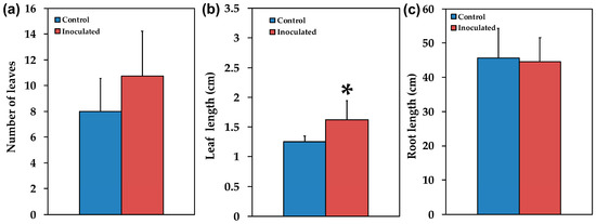The number of leaves (a), the leaf length in cm (b), and the root length in cm (c), of control (non-inoculated) and inoculated Salvia fruticosa plants. Error bars on columns are standard deviations (n = 12). An asterisk (*) represents a significantly different mean between the two treatments by Student’s t-test at a level of p < 0.05.