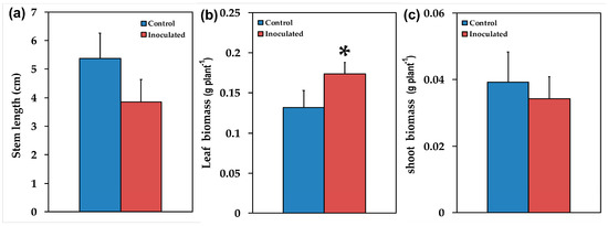The stem length in cm (a), the leaf fresh biomass in g per plant (b), and the shoot fresh biomass in g per plant (c), of control (non-inoculated) and inoculated Salvia fruticosa plants. Error bars on columns are standard deviations (n = 12). An asterisk (*) represents a significantly different mean between the two treatments by Student’s t-test at a level of p < 0.05.