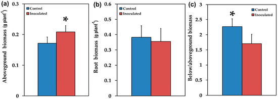 The aboveground fresh biomass in g per plant (a), the root fresh biomass in g per plant (b), and the ratio of belowground to aboveground fresh biomass (c), of control (non-inoculated) and inoculated Salvia fruticosa plants. Error bars on columns are standard deviations (n = 12). An asterisk (*) represents a significantly different mean by Student’s t-test at a level of p < 0.05.