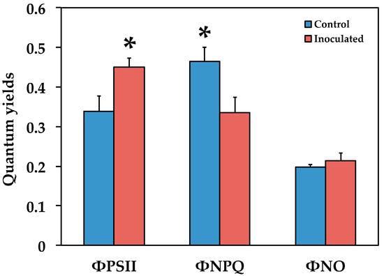 The quantum yields of PSII photochemistry (ΦPSII) of regulated non-photochemical energy loss in PSII (ΦNPQ) and of non-regulated energy loss in PSII (ΦNO) of Salvia fruticosa leaves from control (non-inoculated) and inoculated plants. Error bars on columns are standard deviations (n = 6). An asterisk (*) represents a significantly different mean for the same parameter by Student’s t-test at a level of p < 0.05.