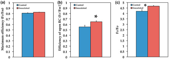 The maximum efficiency of PSII photochemistry (Fv/Fm) (a), the efficiency of open PSII reaction centers (Fv’/Fm’) (b), and the efficiency of the water-splitting complex on the donor side of PSII (Fv/Fo) (c), of Salvia fruticosa leaves from control (non-inoculated) and inoculated plants. Error bars on columns are standard deviations (n = 6). An asterisk (*) represents a significantly different mean between the two treatments by Student’s t-test at a level of p < 0.05.