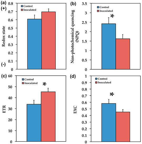 Inoculated S. fruticosa plants exhibited significant lower (23%, p < 0.05) excess excitation energy (EXC) [78] than non-inoculated (Figure 7d). Efficient photoprotective mechanisms are associated with avoidance of excess energy in chloroplasts [79] as it was observed in the inoculated plants, implying that inoculation contributes to prevention of excess excitation energy at PSII (Figure 7d). It is well defined that NPQ and photoinhibition are strongly interdependent [80,81,82] but how much NPQ or dissipation is needed to successfully limit photoinhibition is a complex question to answer [83,84].