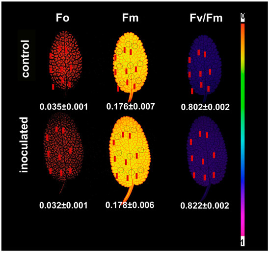 Representative chlorophyll a fluorescence images of the minimum chlorophyll a fluorescence in the dark-adapted leaf (Fo), the maximum chlorophyll a fluorescence in the dark-adapted leaf (Fm), and the maximum efficiency of PSII photochemistry (Fv/Fm) of Salvia fruticosa leaves from control (non-inoculated) and inoculated plants. The color code depicted at the right side of the image ranges from black (pixel values 0.0) to purple (1.0). The nine areas of interest (AOI) are shown in each image. The average value (±SD) of the whole leaf for each parameter is shown.