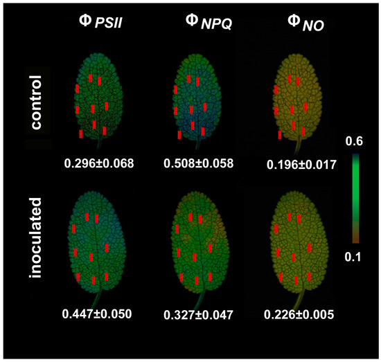 In our experiments we used chlorophyll fluorescence imaging analysis in order to reveal the photosynthetic heterogeneity of the entire leaf zone in both inoculated and non-inoculated plants. The observed spatial heterogeneity between the leaf tip and the leaf base of sage for the parameters ΦPSII and ΦNPQ (Figure 9) may represent the different developmental zones between the leaf tip and the leaf base [42] and a non-uniform gene expression pattern at the base toward the tip [51]. Heterogeneity in photosynthetic performance depending on the leaf age has been repeatedly described in plant species [52,53,54,55,56,57].