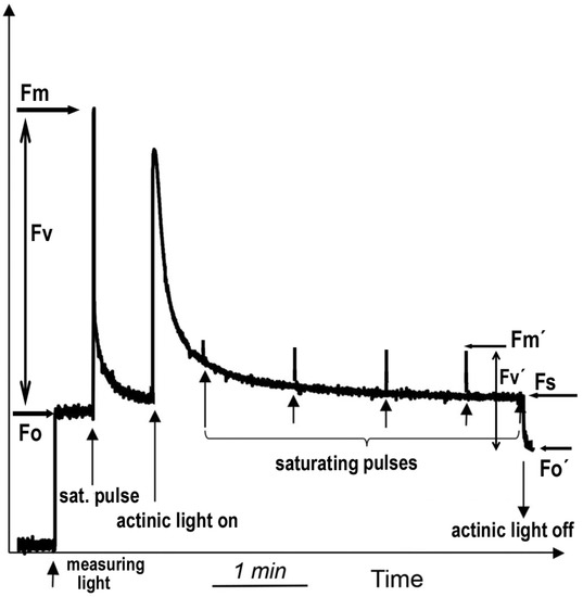 A typical modulated fluorescence trace using dark-adapted leaf material showing how Fo, Fm, Fo’, Fm’ and Fs are formed to measure photochemical and non-photochemical parameters. In the dark-adapted state, a “measuring light” is switched on that is of too low intensity to induce electron transport through PSII but high enough to elicit the minimal level of chlorophyll fluorescence, termed Fo. A brief saturating pulse of light results in the formation of the maximum yield of fluorescence, Fm. The difference between Fm and Fo is the variable fluorescence, Fv. The ratio Fv/Fm is indicator of the maximum quantum yield of PSII photochemistry. The application of saturating pulses under actinic light illumination closes all the reaction centers and provides the maximum fluorescence in the light-adapted state, termed Fm’. The steady-state level of fluorescence in the light is termed Fs and is measured immediately before switching off the actinic light. Fo’ is measured immediately after switching off the actinic light. The difference between Fm’ and Fo’ is the variable fluorescence, Fv’. The ratio Fv’/Fm’ is an indicator of the efficiency of excitation energy captured by open PSII reaction centers.