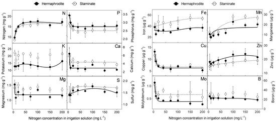 Macro- and microelement concentrations in hermaphroditic and staminate flowers of “Wonderful” pomegranate trees, as a function of N concentration in the irrigation solution, in 2018. Bars represent standard deviation (SD). Lines represent best-fit regression. Regression line equations and significance between treatments are presented in Table S1. No regression line means that no significant difference (p < 0.05) was found between the treatments.