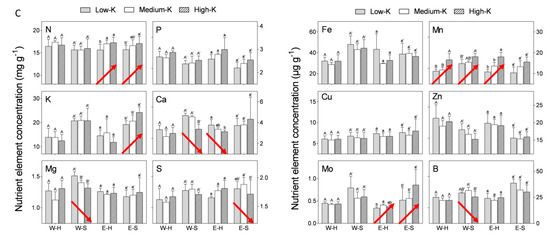 Macro- and microelement concentrations in hermaphroditic and staminate flowers of “Emek” and “Wonderful” pomegranate trees, as a function of (A) N, (B) P, and (C) K levels in the irrigation solution, in 2018. Different letters represent significant differences (p ≤ 0.05) between treatments. Significant trends are marked with an arrow. W-H and W-S, “Wonderful” hermaphroditic and staminate flowers, respectively; E-H and E-S, “Emek” hermaphroditic and staminate flowers, respectively.