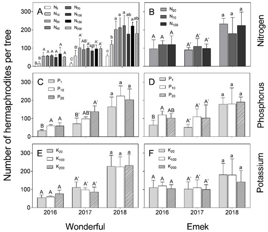 Number of hermaphroditic flowers per tree, as a function of N (A,B), P (C,D) and K (E,F) levels in the irrigation solution, in 2016–2018, for “Emek” and “Wonderful” pomegranates. Data are means ± SD of four replications. Different letters represent significant differences (p ≤ 0.05) between nutrient levels in the same year.