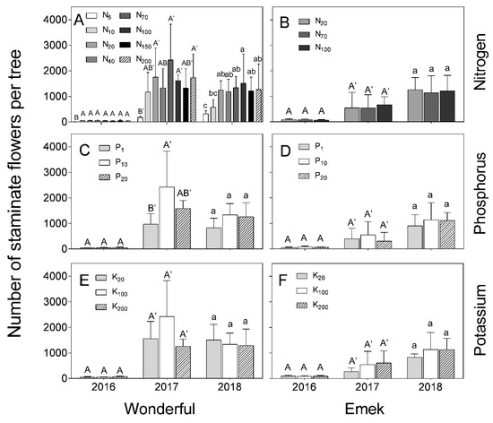 Number of staminate flowers per tree, as a function of N (A,B), P (C,D) and K (E,F) levels in the irrigation solution, in 2016–2018, for “Emek” and “Wonderful” pomegranates. Data are means ± SD of four replications. Different letters represent significant differences (p ≤ 0.05) between nutrient levels in the same year.