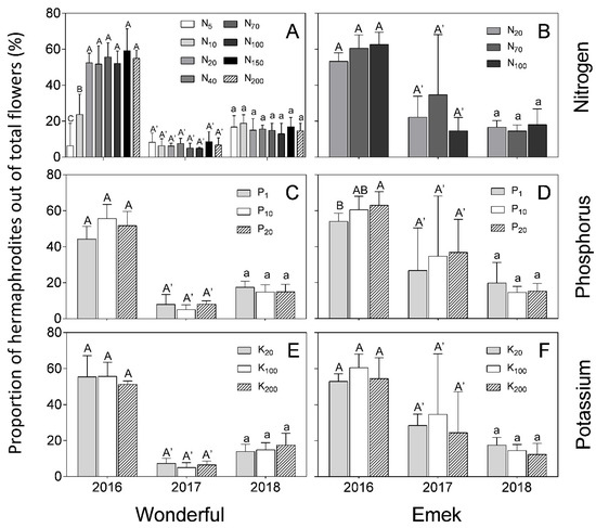 Proportion of hermaphrodites out of total flowers per tree, as a function of N (A,B), P (C,D) and K (E,F) levels in the irrigation solution, in 2016–2018, for “Emek” and “Wonderful” pomegranates. Data are means ± SD of four replications. Different letters represent significant differences (p ≤ 0.05) between nutrient levels in the same year.