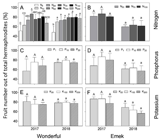 Proportion of fruit number out of total hermaphrodites per tree, as a function of N (A,B), P (C,D) and K (E,F) levels in the irrigation solution, in 2017 and 2018, for “Emek” and “Wonderful” pomegranates. Data are means ± SD of four replications. Different letters represent significant differences (p ≤ 0.05) between nutrient levels in the same year.