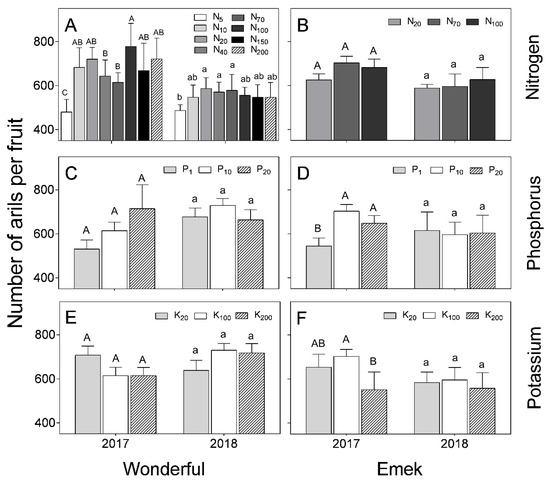 Number of arils per fruit, as a function of N (A,B), P (C,D) and K (E,F) levels in the irrigation solution, in 2017–2018, for “Emek” and “Wonderful” pomegranates. Data are means ± SD of four replications. Different letters represent significant differences (p ≤ 0.05) between nutrient levels in the same year.