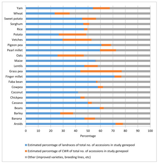 In a study of ex situ holdings of 23 selected genepools of the major crops included in Annex I of the International Treaty, i.e., those materials that countries agreed to form the backbone of the multilateral system of the International Treaty, the authors calculated an average non-weighted percentage of CWR accessions in genebank collections (without the international collections held by the CGIAR genebanks) of the selected genepool worldwide of 9.6%, ranging from 0% for coconuts (there are no CWRs known) to 33% for grass pea (a little bred crop) (Figure 1). The total global holdings considered in the study of the selected genepools (without the collections held by the CGIAR genebanks) were 3,149,371 accessions [76].