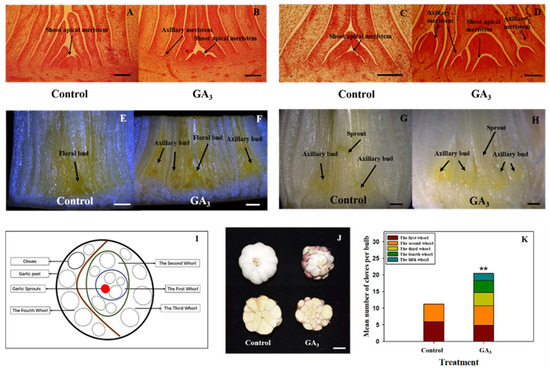 - Liu, H.-J.; Huang, C.-P.; Tong, P.-J.; Yang, X.; Cui, M.-M.; Cheng, Z.-H. Response of axillary bud development in garlic (Allium sativum L.) to seed cloves soaked in gibberellic acid (GA3) solution. J. Integr. Agric. 2020, 19, 1044–1054. [Google Scholar] [CrossRef]