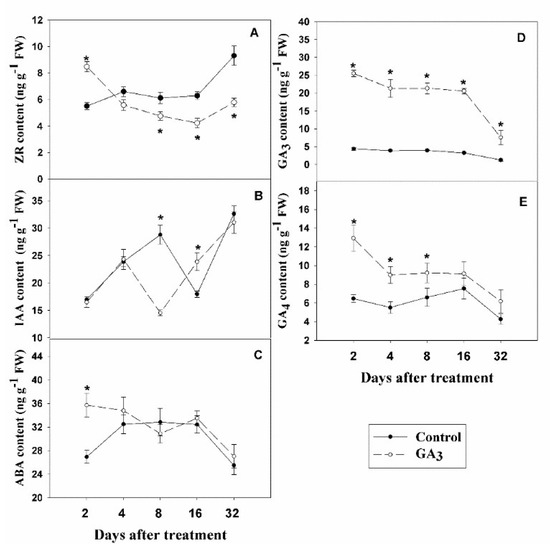 Effect of injecting plants with GA3 on the level of zeatin riboside (ZR) (A), indole-3-acetic acid (IAA) (B), abscisic acid (ABA) (C), GA3 (D) and GA4 (E) in 1 cm-thick stems of garlic. Values are the means ± SD (n = 4) and Student’s t-test was used to determine significant differences at the same period between the control group and GA3 treatment group. Significance levels: * p < 0.05.