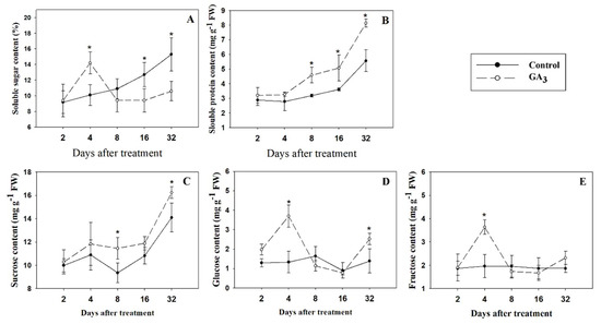 Effect of injecting plants with GA3 on sugars content and soluble protein content in 1 cm-thick stems of garlic: (A) soluble sugar, (B) soluble protein, (C) sucrose, (D) glucose, and (E) fructose. Values are the means ± SD (n = 4) and Student’s t-test was used to determine significant difference at the same period between the control group and GA3 treatment group. Significance levels: * p < 0.05.