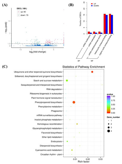 A total of 159 differentially expressed genes (DEGs) were detected in the comparison of GA3 treatment versus water treatment at 2 DAT (Figure 4A and Table S1). To survey the potential functions of genes differentially expressed between control and GA3 treatment, GO (Gene Ontology) and KEGG (Kyoto Encyclopedia of Genes and Genomes) enrichments were performed for function classification. GO analysis showed that 83 DEGs were enriched in 5 GO terms, in which 6 and 77 genes were enriched in biological processes and molecular function, respectively (Figure 4B). Of the 74 genes, 37 and 37 were classified to be associated with heterocyclic compound binding and organic cyclic compound binding, respectively (Figure 4B). Four genes into phenylpropanoid biosynthesis, three genes into ubiquinone and other terpenoid-quinone biosynthesis, three genes into starch and sucrose metabolism and one gene into diterpenoid biosynthesis were detected in KEGG analyses (Figure 4C).