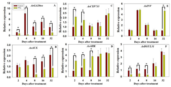 The expression of six key unigenes in stems under GA3 treatment versus control (water treatment) at 2, 4, 8, 16 and 32 DAT: (A) AsGA20ox, (B) AsAUX, (C) AsCYP735, (D) AsAHK, (E) AsINV and (F) AsBGLU31. Data represent mean ± SD of three biological replicates, with transcripts normalized to Allium sativum actin. DAT, days after treatment. Significance level: * p < 0.05.