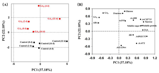 PCA (A) and (B) loading plots of principal components 1 and 2 obtained from phytohormone level, sugars content, soluble content and expression level of key genes in stems of GA3-treated plants and water-treated plants (control) at 2, 4, 8, 16 and 32 DAT.