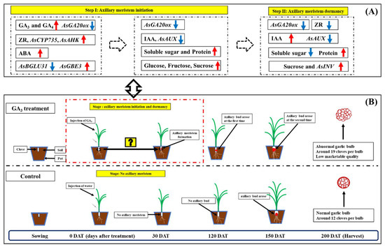 A summary of patterns for GA-induced axillary bud formation in garlic: (A) cross-talk of phytohormone and sugar in the process of axillary meristem development of garlic, (B) axillary bud (clove) development under water (control) and GA3 treatment. Symbols: red arrows indicate upregulation and blue arrows indicate downregulation in (A).