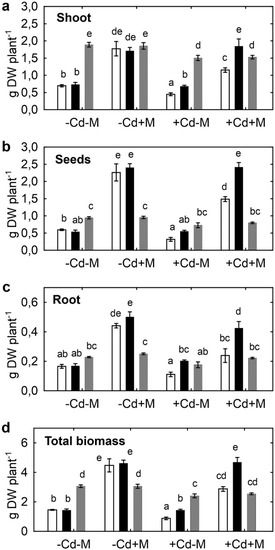 Shoot (a), seeds (b), root (c), and total (d) biomass of pea SGE (unfilled columns), SGECdt (filled columns), and B. juncea (gray columns) grown in uncontaminated or Cd-supplemented soil. Treatments: -Cd-M—uncontaminated soil with uninoculated plants, -Cd+M—uncontaminated soil with inoculated plants, +Cd-M—Cd-supplemented soil with uninoculated plants, +Cd+M—Cd-supplemented soil with inoculated plants. Plants were inoculated with a microbial consortium consisting of Variovorax paradoxus 5C-2, Rhizobium leguminosarum bv. viciae RCAM1066, and Glomus sp. 1Fo. Vertical bars show standard errors. Different letters show significant differences between treatments (least significant difference test, p < 0.05, n = 20). DW stands for dry weight. Plants were analyzed on the 83rd day after planting.