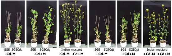 Representative plants of SGE, SGECdt, and Indian mustard (B. juncea) photographed on the 42nd day after planting. Treatments: -Cd-M—uncontaminated soil with uninoculated plants, -Cd+M—uncontaminated soil with inoculated plants, +Cd-M—Cd-supplemented soil with uninoculated plants, +Cd+M—Cd-supplemented soil with inoculated plants. Plants were inoculated with a microbial consortium consisting of Variovorax paradoxus 5C-2, Rhizobium leguminosarum bv. viciae RCAM1066, and Glomus sp. 1Fo.