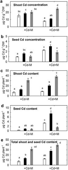 Cadmium concentration in shoot (a) and seeds (b), and Cd content in shoot (c), seeds (d) and aerial part (e) of pea SGE (unfilled columns), SGECdt (filled columns) and B. juncea (gray columns) grown in Cd-supplemented soil. Treatments: +Cd-M—Cd-supplemented soil with uninoculated plants, +Cd+M—Cd-supplemented soil with inoculated plants. Plants were inoculated with a microbial consortium consisting of Variovorax paradoxus 5C-2, Rhizobium leguminosarum bv. viciae RCAM1066, and Glomus sp. 1Fo. Vertical bars show standard errors. Different letters show significant differences between treatments (least significant difference test, p < 0.05, n = 5). DW stands for dry weight. Plants were analyzed on the 83rd day after planting.