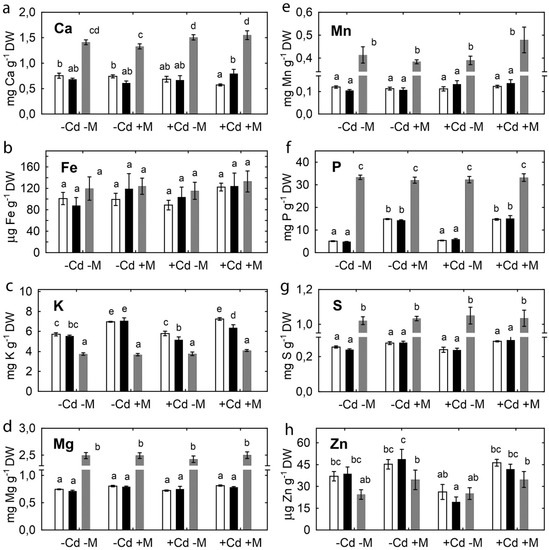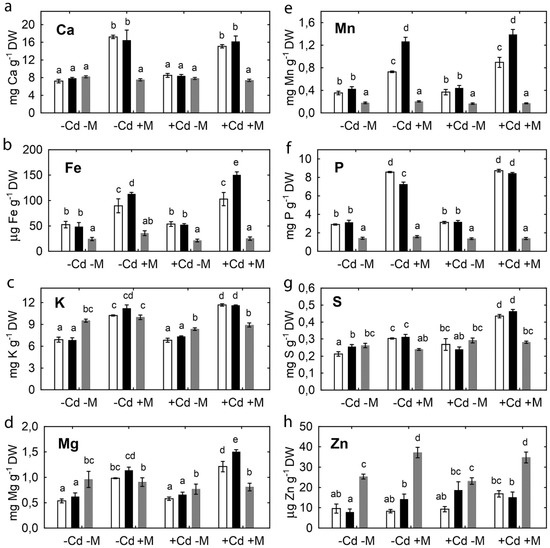 Calcium (a), iron (b), potassium (c), magnesium (d), manganese (e), phosphorus (f), sulfur (g), and zinc (h) in shoots of pea SGE (unfilled columns), SGECdt (filled columns), and B. juncea (gray columns) grown in uncontaminated or Cd-supplemented soil. Treatments: -Cd-M—uncontaminated soil with uninoculated plants, -Cd+M—uncontaminated soil with inoculated plants, +Cd-M—Cd-supplemented soil with uninoculated plants, +Cd+M—Cd-supplemented soil with inoculated plants. Plants were inoculated with a microbial consortium consisting of Variovorax paradoxus 5C-2, Rhizobium leguminosarum bv. viciae RCAM1066, and Glomus sp. 1Fo. Vertical bars show standard errors. Different letters show significant differences between treatments (least significant difference test, p < 0.05, n = 5). DW stands for dry weight. Plants were analyzed at the 83-rd day after planting.