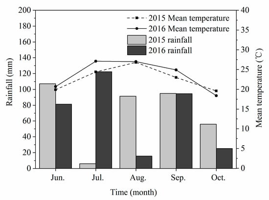 Field trials were conducted in 2015 and 2016 at the Institute of Water Saving Agriculture in Semi-Arid Regions of China, Northwest A & F University, Yangling (34°20′ N, 108°04′ E, 454.8 m altitude), Shaanxi Province, China. The climate is a temperate semiarid monsoon with a mean annual temperature of 12–14 °C, and the mean annual precipitation and evaporation were 580.5 mm and 993.2 mm, respectively. The total yearly sunshine duration was 2158 h, and the no-frost period was 221 days. Most of the rainfall occurred in hot seasons from July to September (Figure 1). The soil of the experimental site consists of Cumuli-Ustic Isohumosols (Chinese Soil Taxonomy), and the soil characteristics from 0 to 40 cm in depth at the research site are shown in Table 1.