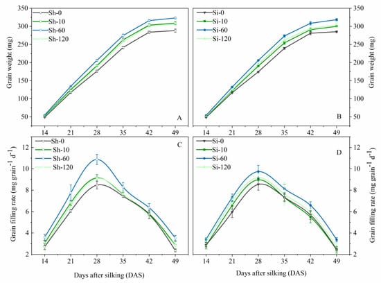 Effects of GA4+7 applications on grain weights and grain-filling rates of maize. Sh-0, Sh-10, Sh-60 and Sh-120 represent shank-treatments with GA4+7 at the rates of 0, 10, 60, and 120 mg L−1, respectively. Si-0, Si-10, Si-60 andSi-120 represent silk-treatments with GA4+7 at the rates of 0, 10, 60, and 120 mg L−1, respectively. The vertical bars represent the ± the standard error of the mean (n = 3).