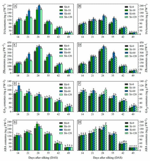 The IAA and ZR contents in maize grains exhibited a similar pattern during the grain filling process. The IAA and ZR contents increased linearly during the initial grain-filling stage and attained the maximum peak curves at 28 DAS for all treatments (Figure 3A–D). The IAA and ZR contents under shank-treatments were greater than those under Sh-0 from 14 to 28 DAS. Compared with Sh-0, the average IAA contents from 14 to 28 DAS under Sh-10, Sh-60 and Sh-120 were increased by 50.2%, 82.7%, and 50.7%, respectively, while the average ZR contents from 14 to 28 DAS increased by 23.6%, 41.0%, and 14.6% under Sh-10, Sh-60 and Sh-120 treatments, respectively. The IAA contents in grains under the Si-60 and Si-120 treatments were greater than those under Si-0 from 14 to 49 DAS, respectively. Compared with Si-0, the mean IAA contents at all sampling stages of Si-60 and Si-120 were raised by 32.4% and 20.3%, respectively. At 49 DAS, Si-10 treatments have no significant effects on ZR contents in maize grains; however, the ZR contents in the grains under other shank-smearing and silk-treatments in every sampling period were significantly higher than those under Sh-0 and Si-0. The mean ZR contents under Sh-10, Sh-60, and Sh-120 treatments were increased by 25.5%, 45.2%, and 24.0%, respectively, compared with Sh-0, while those of Si-10, Si-60, and Si-120 increased by 20.7%, 37.0%, and 22.0%, respectively, compared with Si-0.