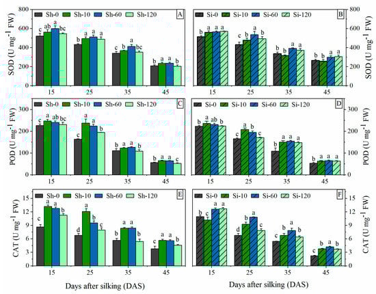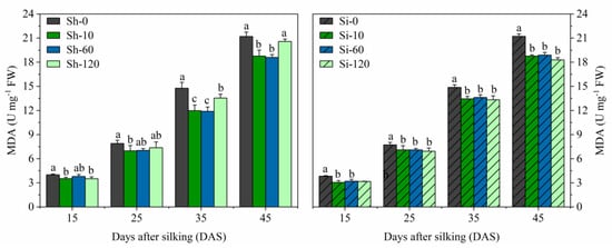 The MDA content increased gradually from 15 to 45 DAS in all the treatments, with the increase in GA4+7 treatments being significantly lower than that of the untreated control (Figure 5). All the silking-treatments (Si-10, Si-60, and Si-120) had significant effects on decreasing the MDA from 15 to 45 DAS and were not significantly different from each other. The Sh-10 and Sh-60 treatments significantly reduced the MDA contents at all sampling times and were not significantly different from each other. Moreover, Sh-120 treatment exhibited relatively higher MDA contents than Sh-10 and Sh-60 treatments, but relatively lower MDA contents than Sh-0 at 15 and 35 DAS. The MDA content in Sh-10 treatment was reduced by 11.8%, 11.7%, 19.0%, and 11.5%, while that of Sh-60 treatment was reduced by 11.9%, 10.0%, 19.5%, and 12.3% compared to Sh-0 at 15, 25, 35, and 45 DAS, respectively. The average MDA content from 15 to 45 DAS in the Si-10, Si-60, and Si-120 treatments was reduced by 1.36 U mg−1 FW, 1.43 U mg−1 FW, 1.22 U mg−1 FW, i.e., 11.5%, 12.0%, and 10.2% reduced, respectively, compared with Si-0.
