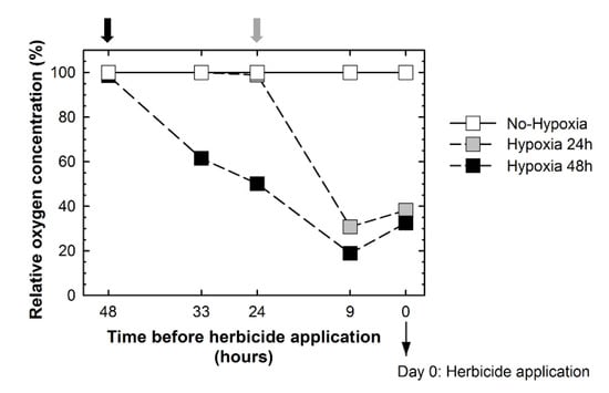 Relative oxygen concentration (%) in the nutrient solution before herbicide application. Black and grey arrows above the graph indicate aeration removal 48 h and 24 h before herbicide application, respectively.