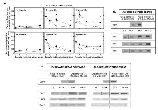The in vitro enzymatic activities of PDC and ADH (Figure 2A) were measured in the roots of the plants from the six studied treatments (Table 1). The herbicide application increased the activity of PDC in the roots of the plants of the No-Hypoxia group. At day 0, the PDC activity detected in the roots of the plants that were exposed to hypoxia was much higher than the activity found in the roots of the plants from the No-Hypoxia group. Once the plants were again aerated, the PDC activity decreased to control values in the plants that were not treated with IMX, while it remained higher in the IMX-treated plants with respect to their controls in the Hypoxia-24h and Hypoxia-48h groups. Similar to the PDC activity, at the beginning of the experiment, the ADH activity was much higher in the groups that were exposed to hypoxia before herbicide application. Once the plants were again aerated, the activity of ADH decreased to control values. In this case, the herbicidal effect in all groups was not very pronounced.