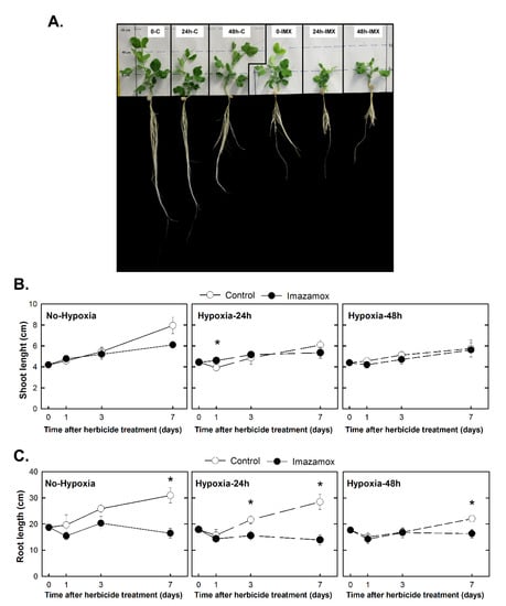 In concordance with the growth arrest previously described in several plant species (e.g., soybean, pea, rice) as a consequence of ALS inhibition [,,,], the results obtained in this experiment also evidenced that IMX provoked a decrease in both shoot and root elongation (Figure 3). Oxygen availability also limits the growth of the tissues [], and root growth of the plants subjected for 48 h to hypoxia was restricted for 3 days after returning to aerobic conditions (Figure 3C). It was not possible to detect a different effect of the herbicide on root growth depending if plants were exposed to hypoxia or not, because IMX arrested the root growth completely in the three groups.