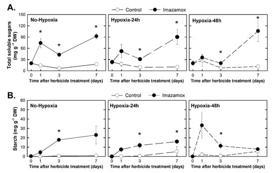 The sum of sucrose, fructose, glucose (Figure 4A), and starch (Figure 4B) contents were measured in the roots of the pea plants. Total soluble sugars were accumulated in the herbicide-treated plants from all the studied groups. While the effect of the herbicide on the non-hypoxic plants was significant as early as day 1 of the IMX treatment, the significant effect on the 24h-IMX and 48h-IMX plants was delayed until the third day of treatment.