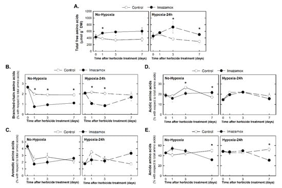 The effects on free amino acid profile were studied in the No-Hypoxia and Hypoxia-24h groups (Figure 5) by monitoring five physiological parameters previously described to be affected by ALS inhibitors: free amino acid content, BCAA, aromatic, acidic, and amide amino acid contents [,,,]. As ALS -inhibitors cause a general increase in the content of free amino acids that could mask the specific changes in each absolute content [,], BCAA, aromatic, acidic and amide amino acids are shown as their relative content in terms of percentage of total amino acid content (Figure 5).
