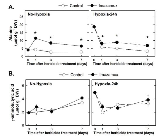 Alanine was accumulated at the onset of the herbicide treatments in plants subjected to hypoxia (Figure 6A). The production of alanine from pyruvate through alanine amino-transferase is another quite important pathway related to fermentation and lack of oxygen []. Alanine was accumulated in herbicide treated plants both in hypoxic and non-hypoxic plants, as was detected in Arabidopsis plants treated with foramsulfuron, [] or pea roots treated with imazethapyr [], other two ALS inhibitors and which can be related to the previously detected induction of alanine amino-transferease [,]. The non-protein amino acid GABA (Figure 6B) was accumulated after 48 h of hypoxia. It is a metabolite that is usually accumulated under stress situations, such as anoxia [,].