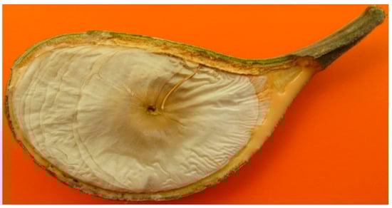 It has a characteristic reddish latex, lenticellated cortex; and big coriaceous, oblong acute discolor leaves, craspedodromous nerved. The pentamerous yellow flowers are grouped in corymbiform inflorescences. As described by their monographs, tomentose calix (2–2.5 mm) of ovate-acute lobes (1.5–1.7 mm) are present; as well as a salviform corolla (6.5–7 mm) which is glabrous externally and tomentose internally below the stamen [1,2]. The androecium is tomentose; the gynoecium glabrous and the style-head has 2 oblong apical appendages. Its follicles (10–14 cm) are dolabriform. Orbicular seeds have 5.8–6.6 cm of diameter (Figure 2).