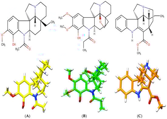 A. spruceanum is a well-recognized taxon, where the literature mentions 19 different indole alkaloids [21,22] from which three were selected for the present In silico Demo-Case Study. They fulfill Lipinski’s rule, which, theoretically, is important for good drug absorption and permeation through biological membranes. These were: aspidocarpine, aspidoalbine and tubotaiwine (Figure 3, Table A1 and Supplementary Material in Table S1).